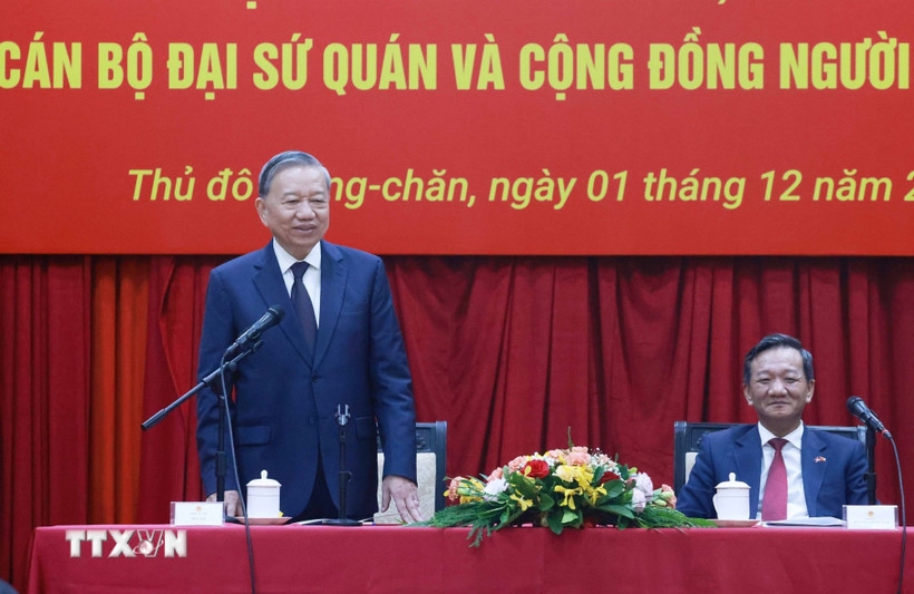 Khẳng định đồng bào ta ở nước ngoài luôn là bộ phận gắn bó máu thịt, không thể tách rời của dân tộc Việt Nam, Tổng Bí thư nêu rõ, Đảng và Nhà nước sẽ tiếp tục hoàn thiện chính sách hỗ trợ kiều bào đầu tư, học tập, nghiên cứu, khởi nghiệp, giảng dạy tiếng Việt, chuyển giao tri thức và tham gia các hoạt động văn hóa, đối ngoại nhân dân. Tổng Bí thư tin tưởng cộng đồng người Việt tại Lào tiếp tục phát triển, ngày càng ổn định, hòa nhập, tiếp tục là cầu nối vững chắc và trực tiếp vun đắp quan hệ hữu nghị đặc biệt Việt Nam - Lào; các hội đoàn tiếp tục phát huy vai trò kết nối kiều bào để tạo dựng một cộng đồng gắn kết, cùng kề vai sát cánh hỗ trợ lẫn nhau.