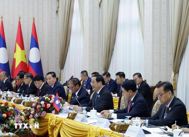 Tổng Bí thư đề nghị hai nước tiếp tục củng cố tin cậy chính trị, duy trì trao đổi đoàn, tiếp xúc cấp cao trên tất cả các kênh, tổ chức tốt Kỳ họp lần thứ 48 Ủy ban liên Chính phủ Việt Nam - Lào diễn ra ngay sau Cuộc gặp cấp cao hai Đảng vào ngày 2-12 để triển khai kết quả hội đàm cấp cao và những thỏa thuận cấp cao giữa hai nước, trong đó có gắn kết chiến lược, gắn kết chiến lược về tầm nhìn phát triển, gắn kết không gian và hạ tầng, các hành lang kinh tế, logistics, năng lượng, chuyển đổi xanh. Hai bên cần thúc đẩy hợp tác kinh tế thiết thực, hiệu quả hơn nữa, trở thành một trụ cột thực sự trong quan hệ hợp tác toàn diện Việt Nam - Lào, tiếp tục triển khai các dự án hợp tác trọng điểm, bảo đảm tiến độ; thúc đẩy các dự án kết nối, nhất là trong lĩnh vực giao thông, năng lượng, phấn đấu đạt mục tiêu tăng trưởng thương mại đạt 5 tỷ USD, hướng tới mục tiêu 10 tỷ USD trong những năm tới.