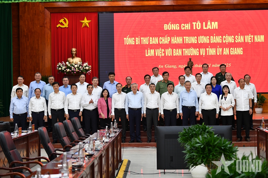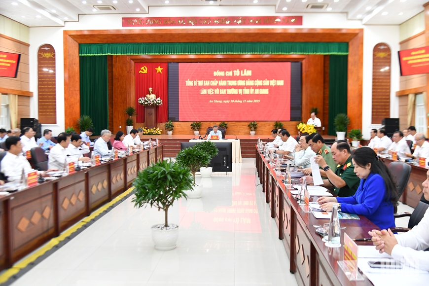 Phát biểu tại buổi làm việc, Tổng Bí thư Tô Lâm ghi nhận và biểu dương, đây là kết quả của sự nỗ lực, đoàn kết, sáng tạo của cả hệ thống chính trị và các tầng lớp nhân dân trong tỉnh; là nền tảng quan trọng để An Giang mới bứt phá mạnh mẽ hơn trong giai đoạn tới. Bên cạnh những kết quả đạt được, Tổng Bí thư chỉ rõ cần có các giải pháp mạnh mẽ, mang tính đột phá nhằm khai thác tốt hơn không gian phát triển mới và phát huy vai trò của một tỉnh đầu nguồn, biển đảo chiến lược của vùng Đồng bằng sông Cửu Long và cả nước. Giai đoạn tới mở ra nhiều cơ hội phát triển mới cho An Giang sau hợp nhất đơn vị hành chính, mở rộng không gian kinh tế biển, biên giới, đồng bằng, chuẩn bị đăng cai APEC Phú Quốc 2027…, nhưng cũng có nhiều khó khăn về hạ tầng, môi trường, an sinh, xây dựng bộ máy hai cấp, yêu cầu tăng trưởng nhanh và bền vững trong bối cảnh cạnh tranh lớn trong vùng.