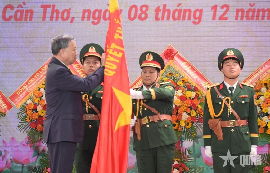 | Tổng Bí thư Tô Lâm gắn huy hiệu Anh hùng LLVT nhân dân lên Quân kỳ Quyết thắng Quân khu 9. |