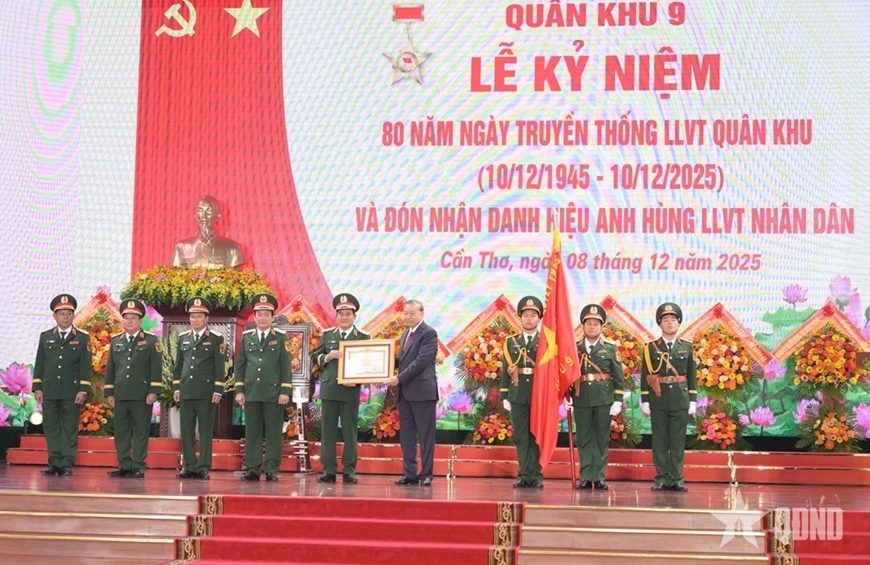 | Thay mặt lãnh đạo Đảng, Nhà nước, Tổng Bí thư Tô Lâm trao Danh hiệu Anh hùng LLVT nhân dân tặng LLVT Quân khu 9. |