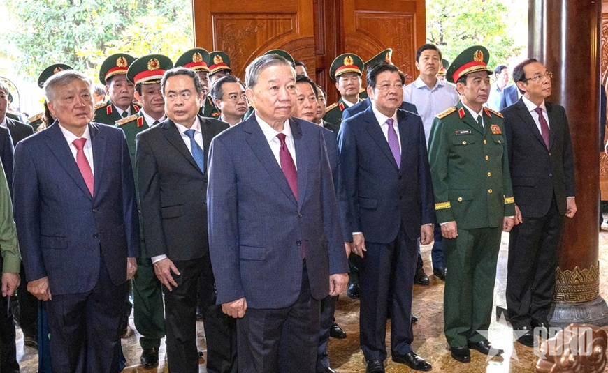 | Tổng Bí thư Tô Lâm và các đại biểu dâng hương tưởng niệm các Anh hùng liệt sĩ Quân khu 9. |