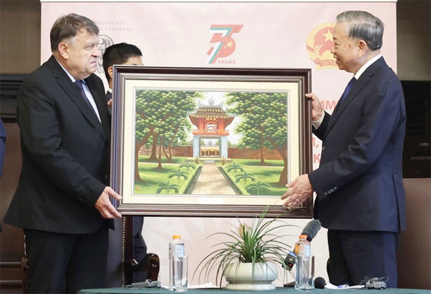 | Tổng Bí thư Tô Lâm tặng Hiệu trưởng Đại học Sofia Georgi Valchev bức tranh lưu niệm. Ảnh: TTXVN |