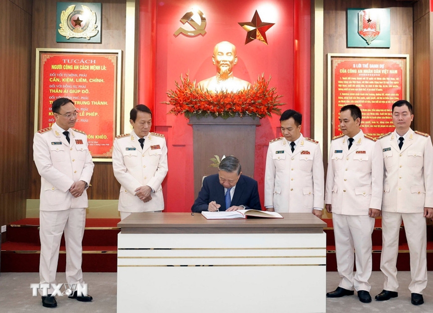 Nhân dịp này, ghi Sổ vàng truyền thống của Cục An ninh điều tra Bộ Công an, Tổng Bí thư tin tưởng rằng “với truyền thống anh hùng, 75 năm vẻ vang, với khát vọng cống hiến và quyết tâm chính trị, Cục An ninh điều tra Bộ Công an sẽ hoàn thành xuất sắc mọi nhiệm vụ được giao, học tập và làm theo sáu điều Bác Hồ dạy về tư cách người Công an cách mệnh, thấm nhuần và thực hiện nghiêm túc tinh thần “Trung thành nhất, kỷ luật nhất, gần dân nhất”, xây dựng Cục An ninh điều tra Bộ Công an là lực lượng trung thành, bản lĩnh, trí tuệ, nhân văn.