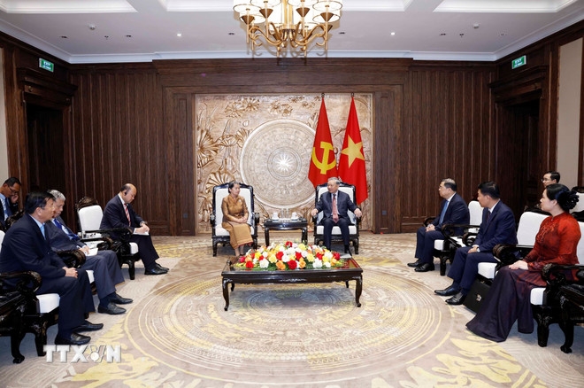 | Tổng Bí thư Tô Lâm tiếp bà Men Sam An, Phó chủ tịch Đảng Nhân dân Campuchia, Chủ tịch Hội đồng Quốc gia Mặt trận Đoàn kết Phát triển Tổ quốc Campuchia. |