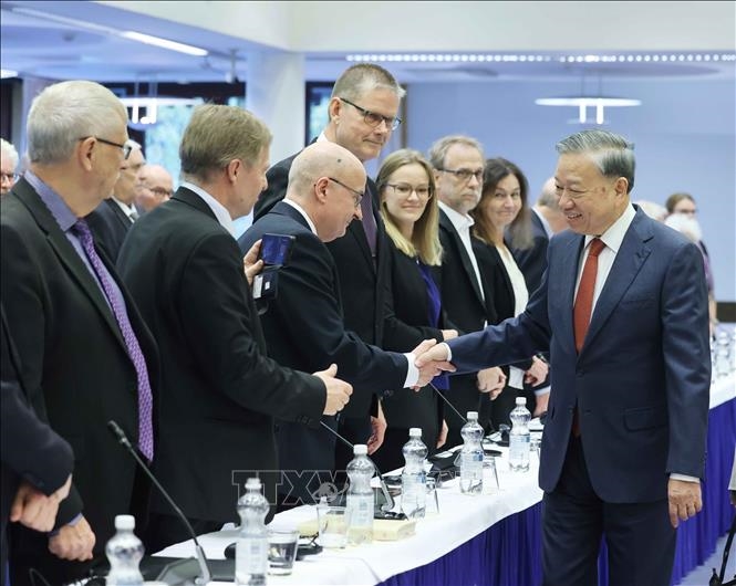 Trong chương trình chuyến thăm chính thức Phần Lan, chiều 22-10 (giờ địa phương), tại Thủ đô Helsinki, Tổng Bí thư Tô Lâm tiếp Hội hữu nghị Phần Lan - Việt Nam và nhóm chuyên gia Phần Lan từng tham gia các dự án hỗ trợ tại Việt Nam.