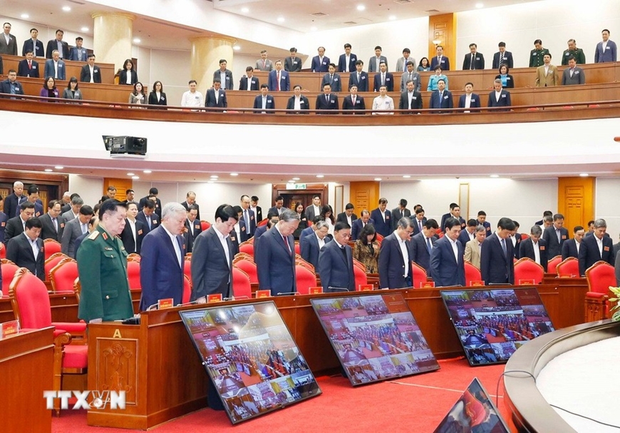 | Tổng Bí thư Tô Lâm và các đại biểu các đại biểu dành 1 phút mặc niệm những người bị thiệt mạng do bão lũ. |