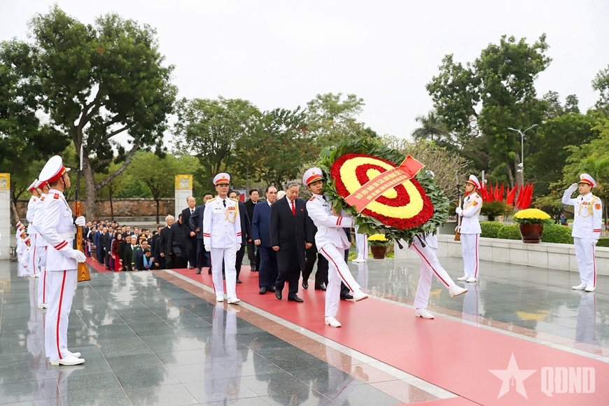 | Tổng Bí thư Tô Lâm dẫn đầu đoàn đại biểu đặt vòng hoa, tưởng nhớ các anh hùng liệt sĩ tại Đài tưởng niệm các Anh hùng liệt sĩ trên đường Bắc Sơn. |