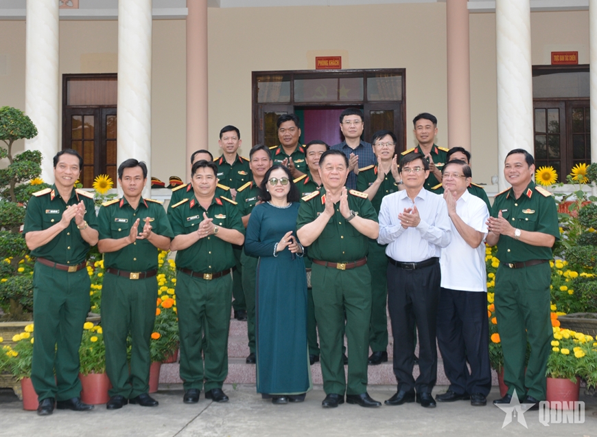 | Đại tướng Nguyễn Trọng Nghĩa và các đại biểu chụp ảnh chung tại Ban chỉ huy Phòng thủ khu vực 1 - Long Thuận. |
