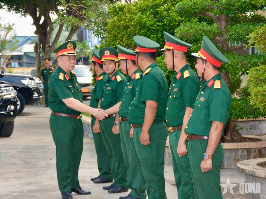| Đại tướng Nguyễn Trọng Nghĩa thăm, làm việc tại Ban Chỉ huy Phòng thủ khu vực 1 - Long Thuận, Bộ CHQS tỉnh Đồng Tháp. |