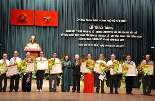 | Lãnh đạo TP Hồ Chí Minh chúc mừng các Nghệ nhân ưu tú. |