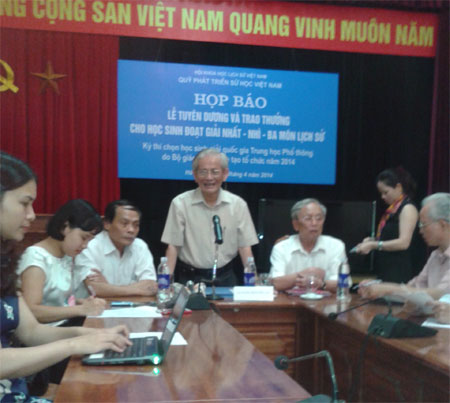 QĐND Online - Đó là thông tin được GS, NGND Phan Huy Lê, Chủ tịch Hội Khoa học Lịch sử Việt Nam, Chủ tịch Hội đồng quản lý Quỹ Phát triển sử học Việt Nam đưa ra tại buổi họp báo Lễ tuyên dương và trao giải cho các em học sinh đoạt giải nhất, nhì, ba môn lịch sử trong kỳ thi học sinh giỏi quốc gia THPT năm 2014 do Hội Khoa học Lịch sử Việt Nam phối hợp với Quỹ phát triển Sử học Việt Nam tổ chức sáng 22-4, tại Hà Nội.