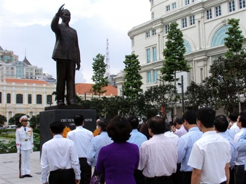 | Đoàn đại biểu dâng hoa tại Tượng đài Chủ tịch Hồ Chí Minh |