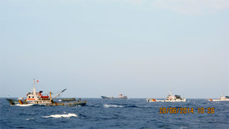 Các tàu Trung Quốc còn dàn hàng ngang với chiều dài khoảng 14-16 hải lý theo hướng Đông Bắc-TâyNam, sử dụng tốc độ cao ngăn cản, uy hiếp các tàu của ngư dân ta đang đánh bắt thủy sản (có lúc tàu Trung Quốc cách tàu cá của ngư dân ta chỉ khoảng 100m). Đặc biệt, tại khu vực ngư trường truyền thống của ngư dân ta ở phía Tây-Tây Nam, cách giàn khoan 35-40 hải lý, 54 tàu cá Trung Quốc dưới sự hỗ trợ của tàu Hải cảnh số hiệu 46102 thực hiện hành vi ngăn cản, uy hiếp tàu cá của ngư dân Việt Nam.
