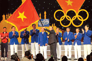 | Thứ trưởng Bộ Văn hóa, Thể thao và Du lịch Nguyễn Danh Thái trao cờ Tổ quốc cho đoàn thể thao Việt Nam. Nguồn: Internet |