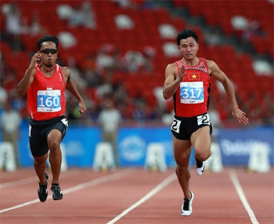 | Lê Trọng Hinh (bên phải) là một trong những VĐV chạy tốc độ nhanh nhất Đông Nam Á. |