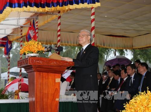 Việt Nam và Cam-pu-chia là hai nước láng giềng gần gũi và thân thiết, núi sông liền một dải, nhân dân hai nước cùng uống chung dòng nước sông Mê Công. Trải qua nhiều giai đoạn lịch sử, vận mệnh của hai nước luôn gắn kết với nhau chặt chẽ, điều này đã được thực tế chứng minh: Bất kỳ một giai đoạn nào đó quan hệ hai nước trục trặc thì đều tổn hại nghiêm trọng đến lợi ích của cả hai bên; ngược lại, quan hệ giữa hai nước tốt đẹp luôn tạo cơ hội và sự ổn định cho sự phát triển của cả Việt Nam và Cam-pu-chia; mặt khác, sự gần gũi về địa lý và sự gắn bó, tương đồng về lịch sử khiến cho nhân dân hai nước luôn có sự hiểu biết, thông cảm và chia sẻ, đồng thời là điều kiện thuận lợi để tăng cường quan hệ hai nước trong tình hình mới. Việt Nam chúng tôi có câu "Ăn quả nhớ người trồng cây". Hôm nay, chúng ta long trọng tổ chức Lễ khánh thành Đài hữu nghị Việt Nam - Cam-pu-chia trên mảnh đất thiêng liêng mang tên Quốc vương Nô-rô-đôm Xi-ha-núc chính là sự tri ân của Đảng, Nhà nước, nhân dân và quân đội hai nước chúng ta đối với các anh hùng liệt sĩ, Quân tình nguyện Việt Nam và cán bộ, chiến sĩ quân đội Hoàng gia Cam-pu-chia đã hy sinh vì nền độc lập, tự do của đất nước và hạnh phúc của nhân dân. Lịch sử không bao giờ bị lãng quên và không ai bị quên lãng. Vinh quang đời đời thuộc về những người con ưu tú đã ngã xuống vì Tổ quốc của cả hai dân tộc.