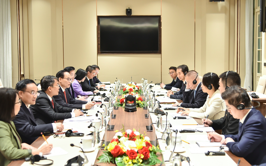 Đồng chí Lê Hoài Trung, Ủy viên Bộ Chính trị, Bí thư Đảng ủy, Bộ trưởng Bộ Ngoại giao hội đàm với đồng chí Lưu Hải Tinh, Ủy viên Trung ương Đảng, Trưởng Ban Liên lạc Đối ngoại Trung ương Đảng Cộng sản Trung Quốc, Đặc phái viên của Tổng Bí thư, Chủ tịch Trung Quốc Tập Cận Bình.