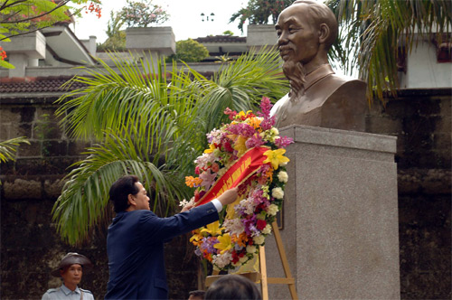 | Thủ tướng Nguyễn Tấn Dũng đặt vòng hoa tại Đài tưởng niệm Chủ tịch Hồ Chí Minh trong Công viên ASEAN. Ảnh: Nhật Bắc |