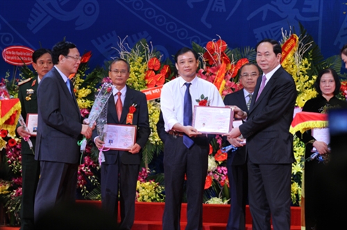 | Đồng chí Trần Đại Quang và Phạm Vũ Luận trao giấy chứng nhận chức danh cho các GS, PGS năm 2015. |