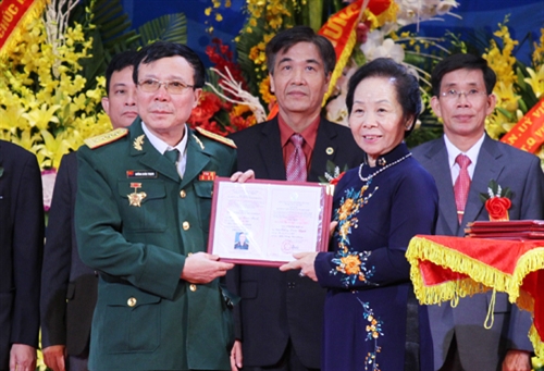 | Phó Chủ tịch nước Nguyễn Thị Doan trao giấy chứng nhận chức danh cho các GS, PGS năm 2015. |