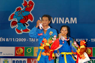 | Cặp võ sĩ Phạm Thị Phượng và Nguyễn Văn Cường mang về cho đoàn thể thao Việt Nam Chiếc huy chương vàng đầu tiên. |