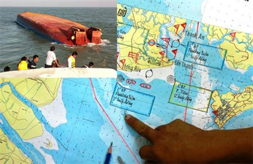 | Lực lượng cứu hộ tiếp cận tàu Hoàng Phúc 18 (ảnh nhỏ) và vị trí vụ tai nạn trên sông Soài Rạp. (Ảnh: Zing News) |