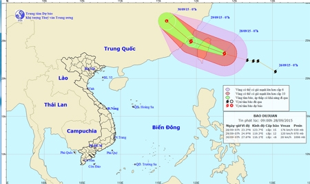 QĐND Online - Theo Trung tâm Dự báo khí tượng thủy văn Trung ương, hồi 8 giờ ngày 28-9, vị trí tâm bão ở vào khoảng 23,4 độ Vĩ Bắc; 123,6 độ Kinh Đông, cách đảo Đài Loan (Trung Quốc) 230km về phía Đông. Sức gió mạnh nhất ở vùng gần tâm bão mạnh cấp 15 (tức là từ 165 đến 185km một giờ), giật trên cấp 17.