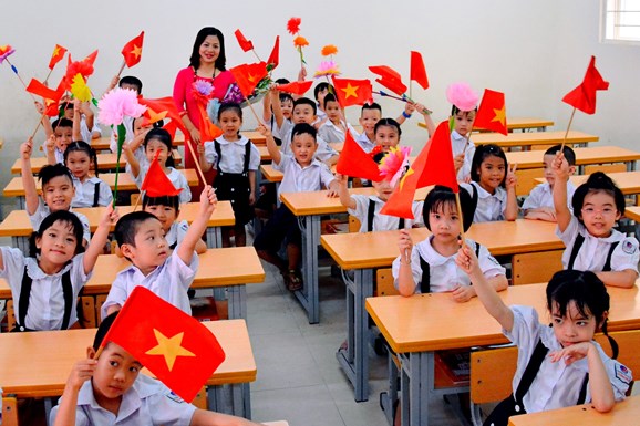 Giáo viên và học sinh lớp 1A2, Trường Tiểu học Tô Vĩnh Diện (Đống Đa, Hà Nội). Ảnh: Chiến Thắng. |