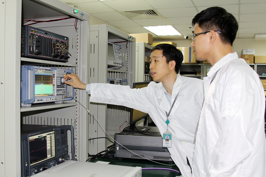 | Kỹ sư của Tổng công ty Công nghiệp công nghệ cao (Viettel) tiến hành đo kiểm chỉ tiêu các bảng mạch trong khí tài (ảnh chụp trước ngày 27-4-2021). Ảnh: HOÀNG HÀ |
