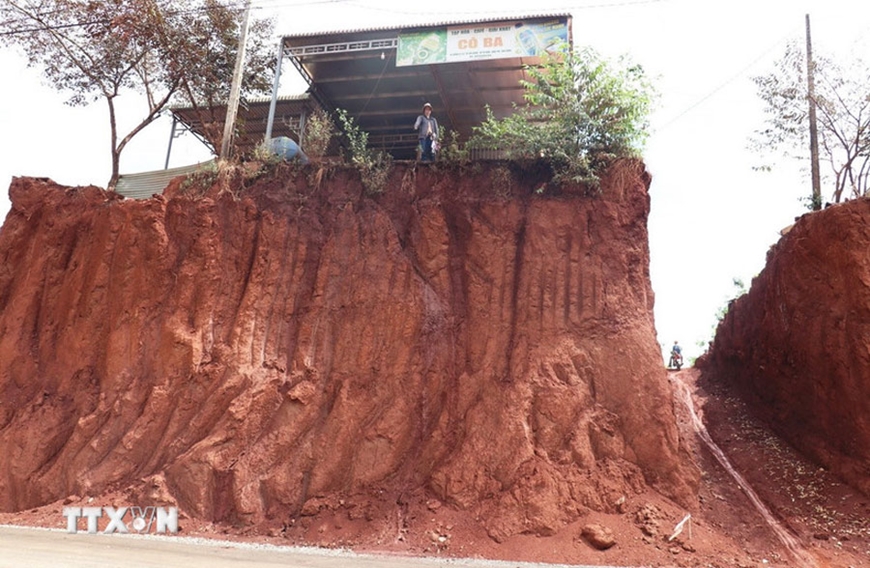 | Ngôi nhà của chị Nguyễn Thị Mộng Cầm, ấp Suối Nhung, xã Tân Lợi, cao hơn so với đường gần 9 mét, khi hạ cốt nền, thi công tuyến đường ĐT.753. Ảnh: TTXVN |