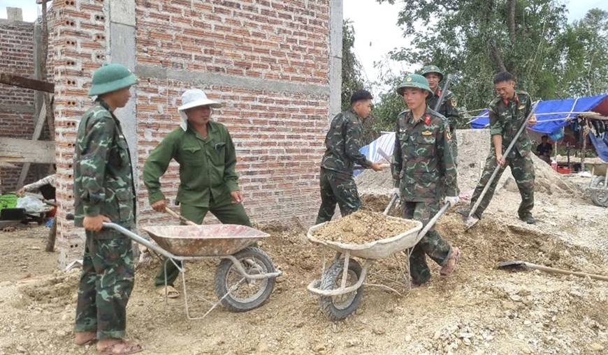 Cán bộ, chiến sĩ Trung đoàn 741 (Bộ CHQS tỉnh Điện Biên) tham gia chương trình xóa nhà tạm, nhà dột nát. Ảnh: qdnd.vn |