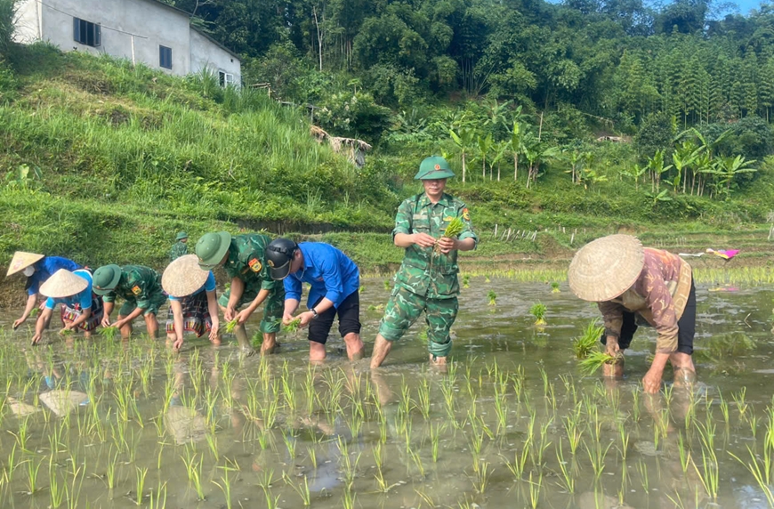 | Cán bộ, nhân viên Đồn Biên phòng Yên Khương (Ban chỉ huy Bộ đội Biên phòng tỉnh Thanh Hóa) giúp nhân dân bản Tứ Chiềng thực hiện mô hình "Trồng lúa nếp hạt cau". |