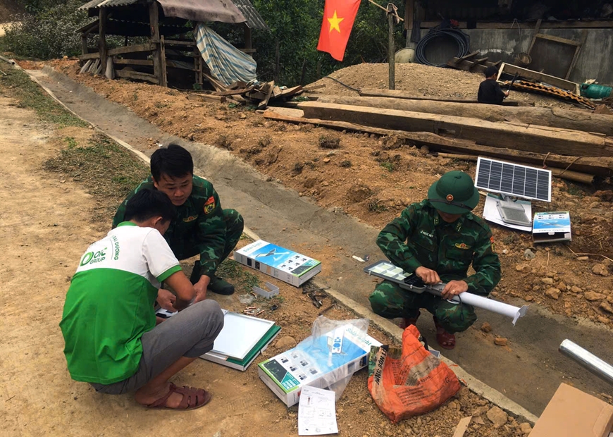 | Cán bộ, nhân viên Đồn Biên phòng Bát Mọt (Ban chỉ huy Bộ đội Biên phòng tỉnh Thanh Hóa) hỗ trợ và lắp đèn năng lượng tại thôn Ruộng, xã Bát Mọt. |