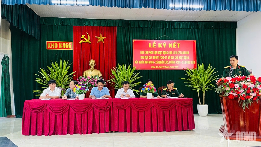 | Lễ ký kết quy chế phối hợp hoạt động cụm liên kết an ninh khu vực các đơn vị Tổng cục Hậu cần - Kỹ thuật với địa phương nơi đóng quân của Kho K866, Cục Quân khí. Ảnh: HOÀNG ANH |