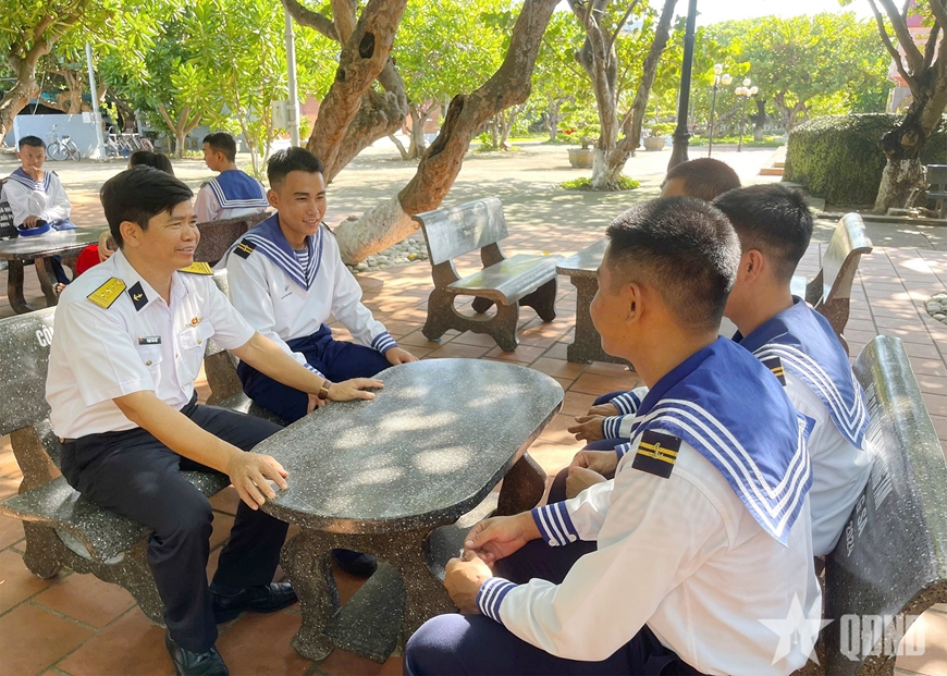 | Thượng tá Phạm Tiến Điệp, Chính trị viên đảo Trường Sa trò chuyện với chiến sĩ đơn vị. |