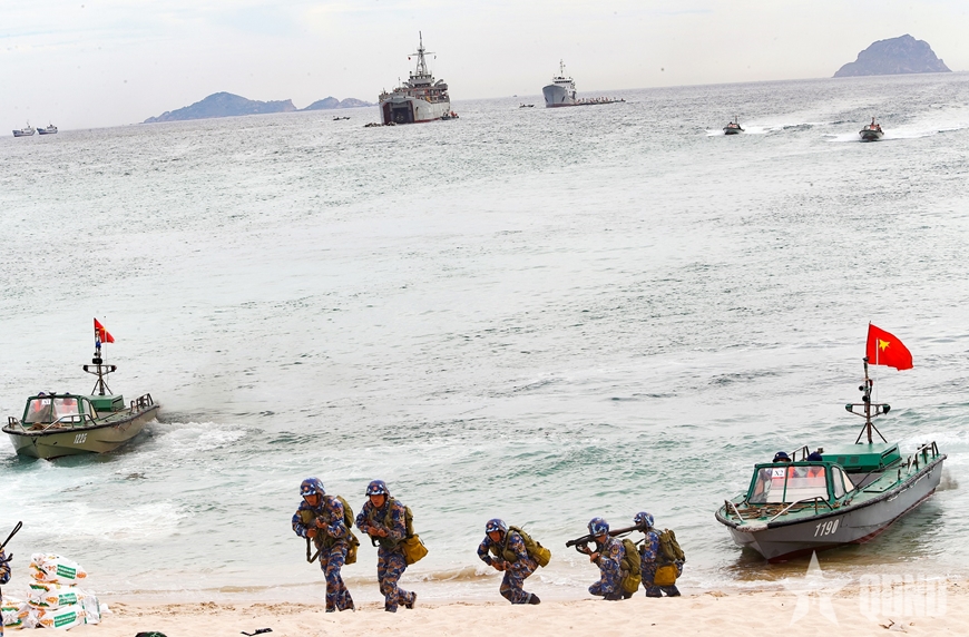 | Cán bộ, chiến sĩ Vùng 4 Hải quân huấn luyện hiệp đồng đổ bộ đường biển. |