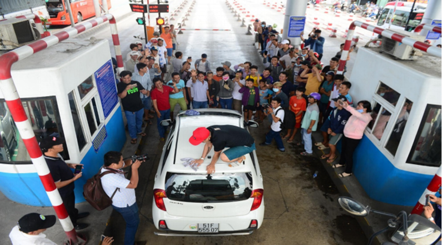 | Lợi dụng phản đối trạm BOT Cai Lậy ở tỉnh Tiền Giang năm 2017, một số lái xe đã có những hành động quá khích, vi phạm pháp luật, nhằm gây áp lực cho trạm BOT. Ảnh: TTXVN |