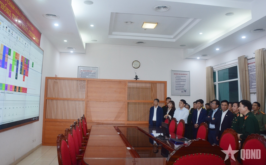 | Đoàn công tác Ban Tuyên giáo và Dân vận Trung ương nghe giới thiệu về công tác giáo dục lý luận chính trị của Học viện Hậu cần tại phòng điều hành. Ảnh: VĂN CHIỂN |