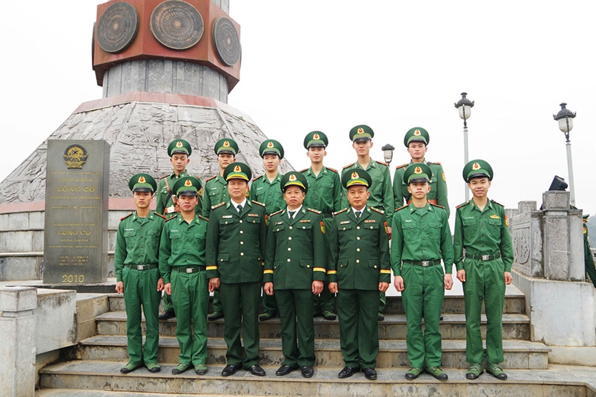 | Cán bộ, đảng viên, chiến sĩ Đồn Biên phòng Lũng Cú thực hiện nhiệm vụ bên cột cờ Lũng Cú. |
