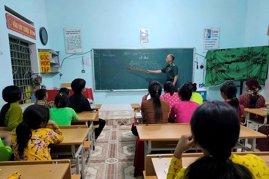 | Thiếu tá QNCN Vàng Gỉ Khoán dạy xóa mù chữ cho bà con dân bản. |