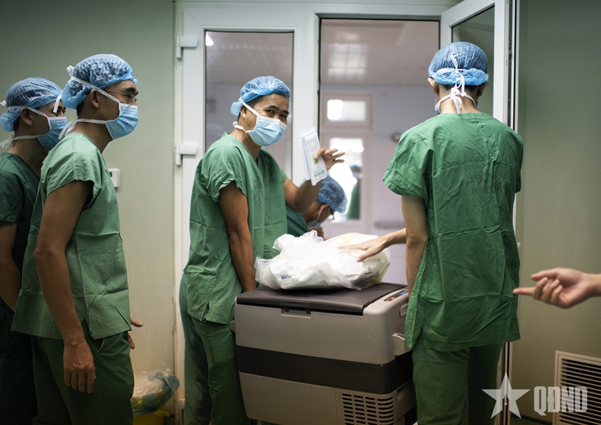 | Đội ngũ y, bác sĩ vận chuyển tạng của người hiến bằng thiết bị chuyên dụng. |