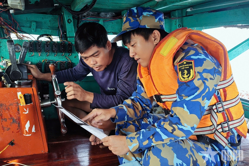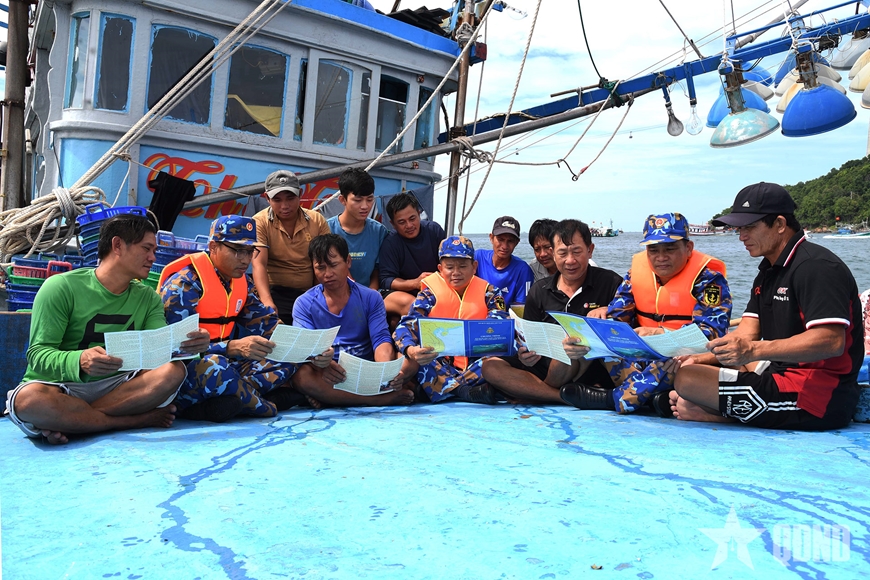 | Cán bộ, chiến sĩ thường xuyên tiếp cận tàu cá để tuyên truyền, giải thích các quy định của pháp luật cho ngư dân. |