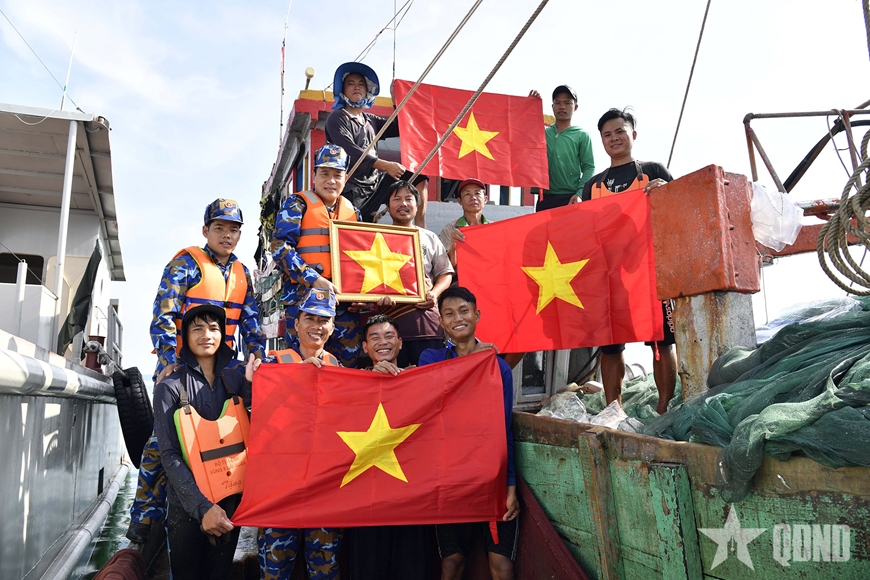 Đoàn công tác Vùng 5 Hải quân tặng cờ Tổ quốc, động viên ngư dân yên tâm vươn khơi, bám biển đúng pháp luật.