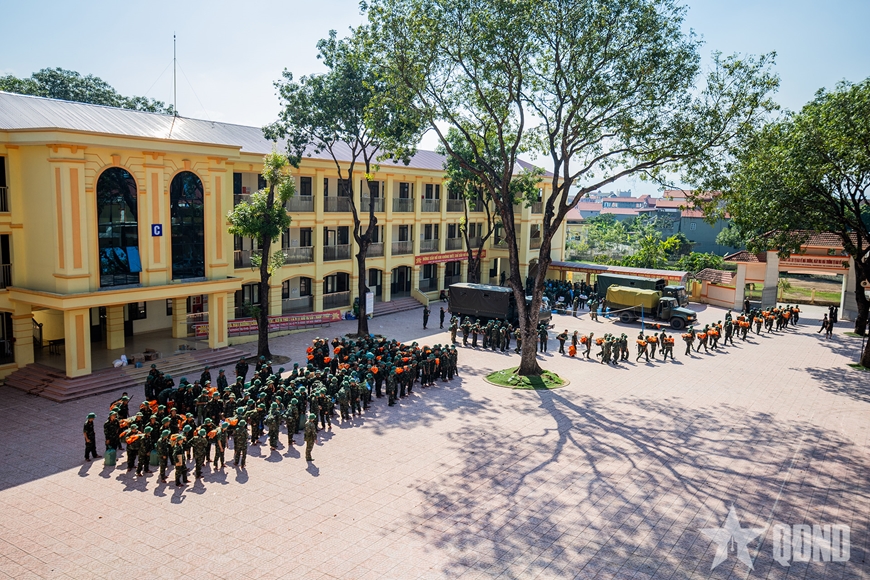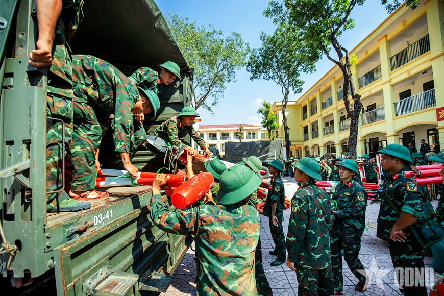 Các chiến sĩ khẩn trương triển khai phương tiện, vật dụng; cuốc, xẻng, bao tải .... |