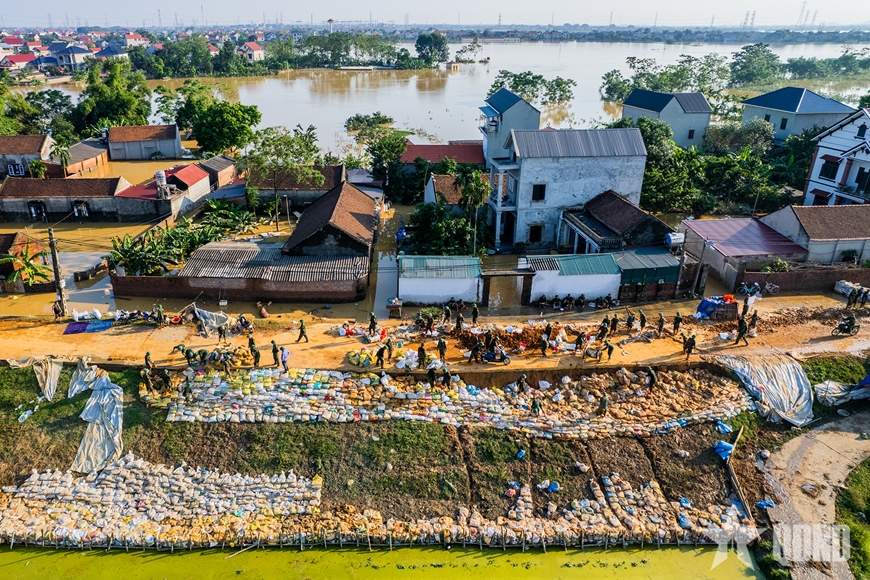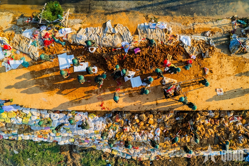 Trong lúc nguy cơ cấp bách, hơn 700 cán bộ, chiến sĩ Trung đoàn 141, Sư đoàn 3 đã khẩn trương hành quân đến hiện trường, giúp nhân dân xã Hợp Thịnh chống lũ