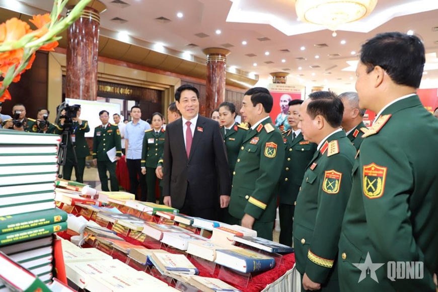 Chủ tịch nước Lương Cường và lãnh đạo Quân ủy Trung ương, Bộ Quốc phòng tham quan trưng bày của Thư viện Quân đội tại Đại hội đại biểu Đảng bộ Quân đội lần thứ XII.