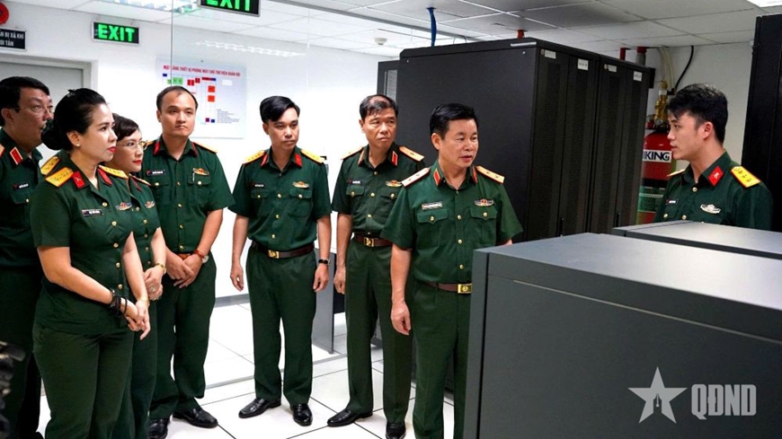 Trung tướng Đỗ Xuân Tụng, Phó chủ nhiệm Tổng cục Chính trị QĐND Việt Nam kiểm tra công tác chuyển đổi số tại Thư viện Quân đội. |