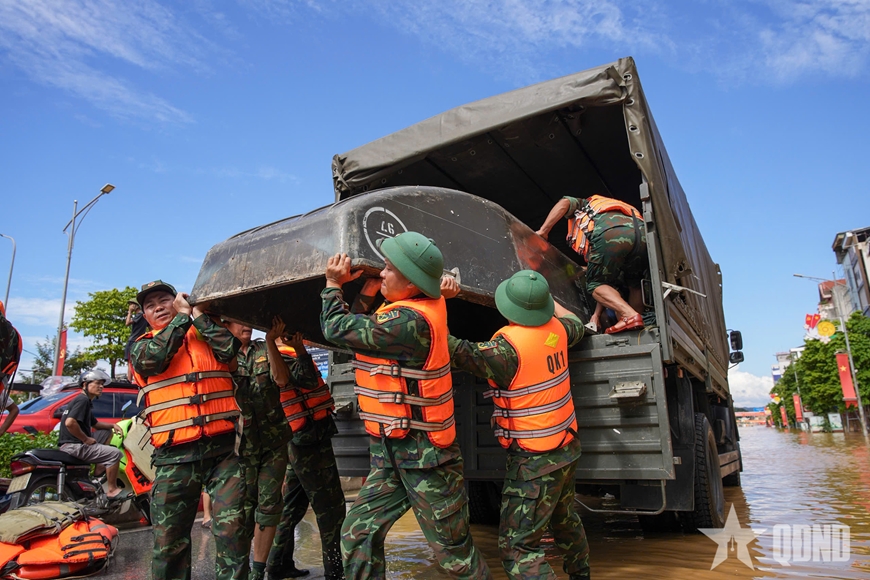 | Lực lượng vũ trang Quân khu 1 triển khai phương tiện giúp nhân dân tỉnh Thái Nguyên khắc phục hậu quả lũ lụt. |