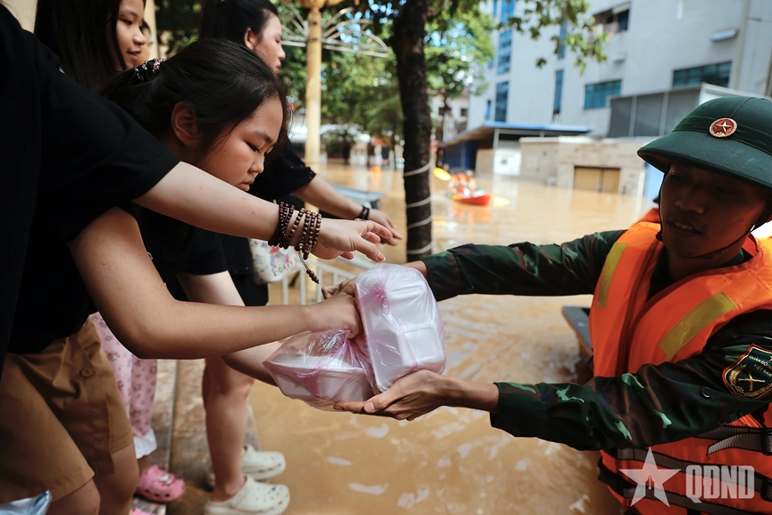 | Đoàn cứu hộ Quân khu 1 vận chuyển đồ ăn, nước uống cho người dân khu vực bị ngập sâu ở phường Phan Đình Phùng, tỉnh Thái Nguyên. |